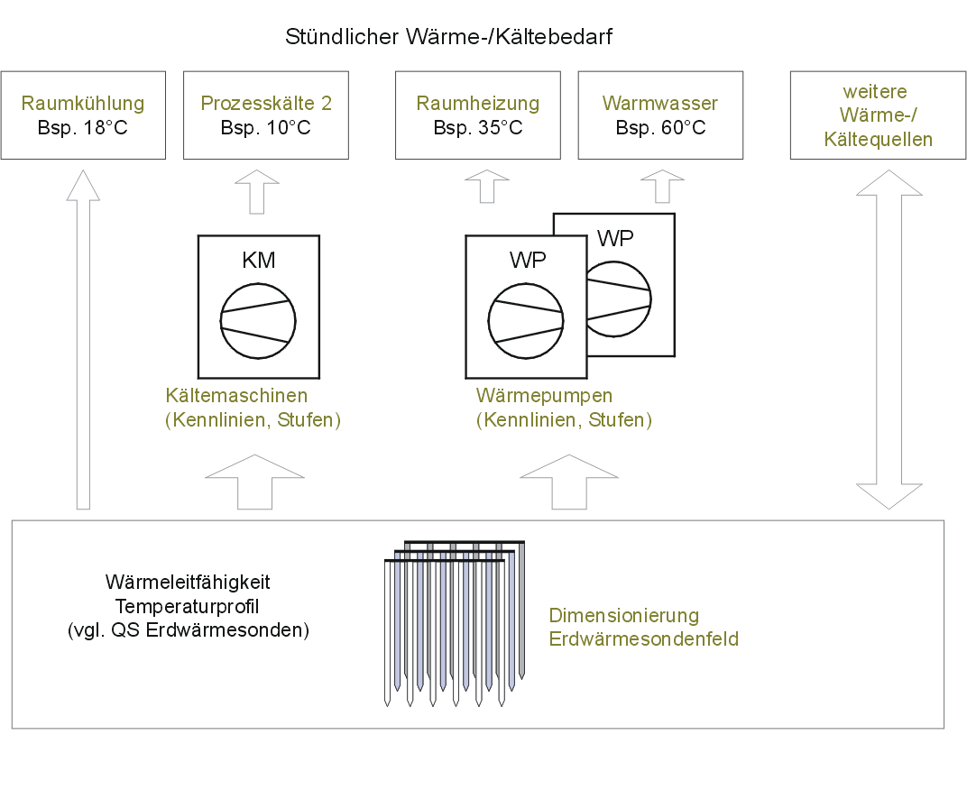 In der Online-Plattform GEOWATTCORE werden die Leistungskennlinien der Wärmepumpen (Abhängigkeit des COP von der Soletemperatur) sowie allfällige Stufenschaltungen stündlich berücksichtigt. Es können beliebige Anordnungen von Erdwärmesonden in einem Feld berechnet werden. Zusätzliche Wärme-/Kältequellen (Beispiel Rückkühler) können integriert werden.